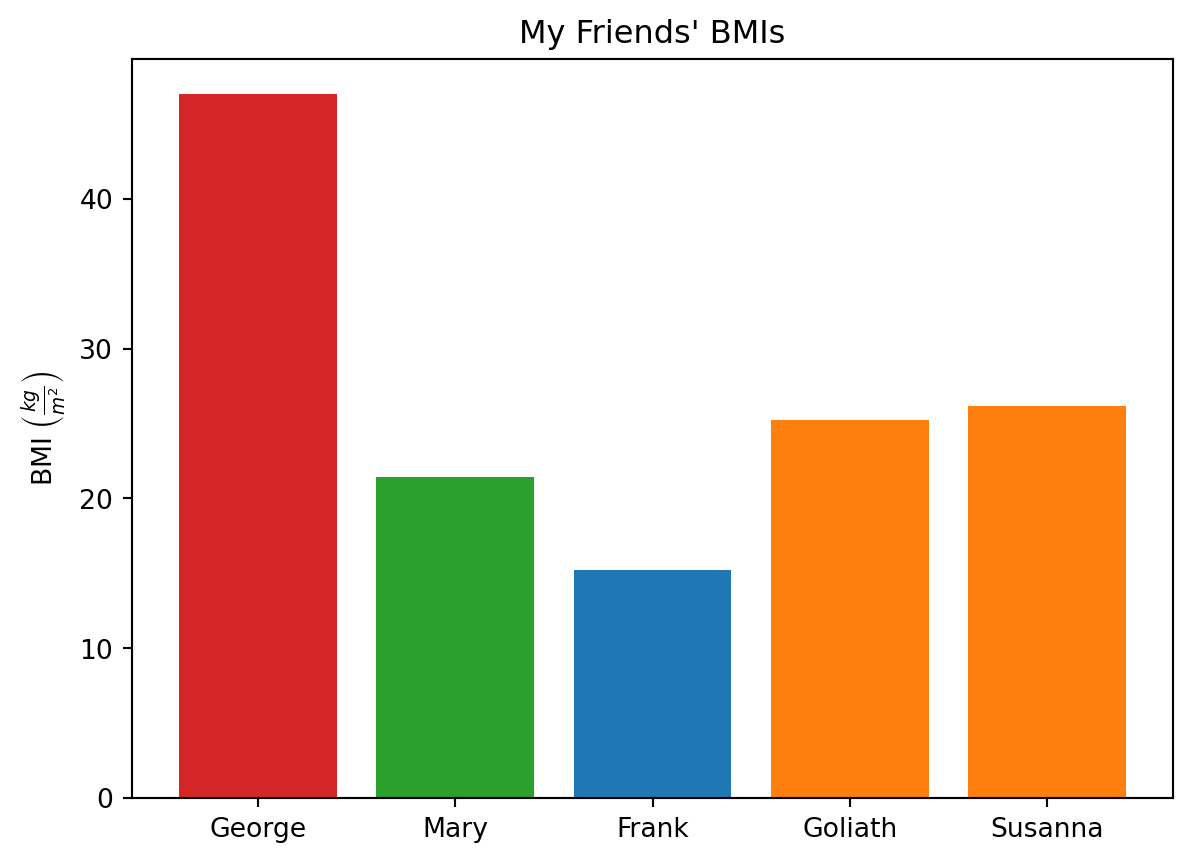 plt.show()The bar chart shows my friend’s BMI values range from approximately 17 to 47. Frank has the lowest BMI and is categorised as underweight, while George is classified as obese, with his BMI being greater than 30. Mary is the only person that has a normal BMI.