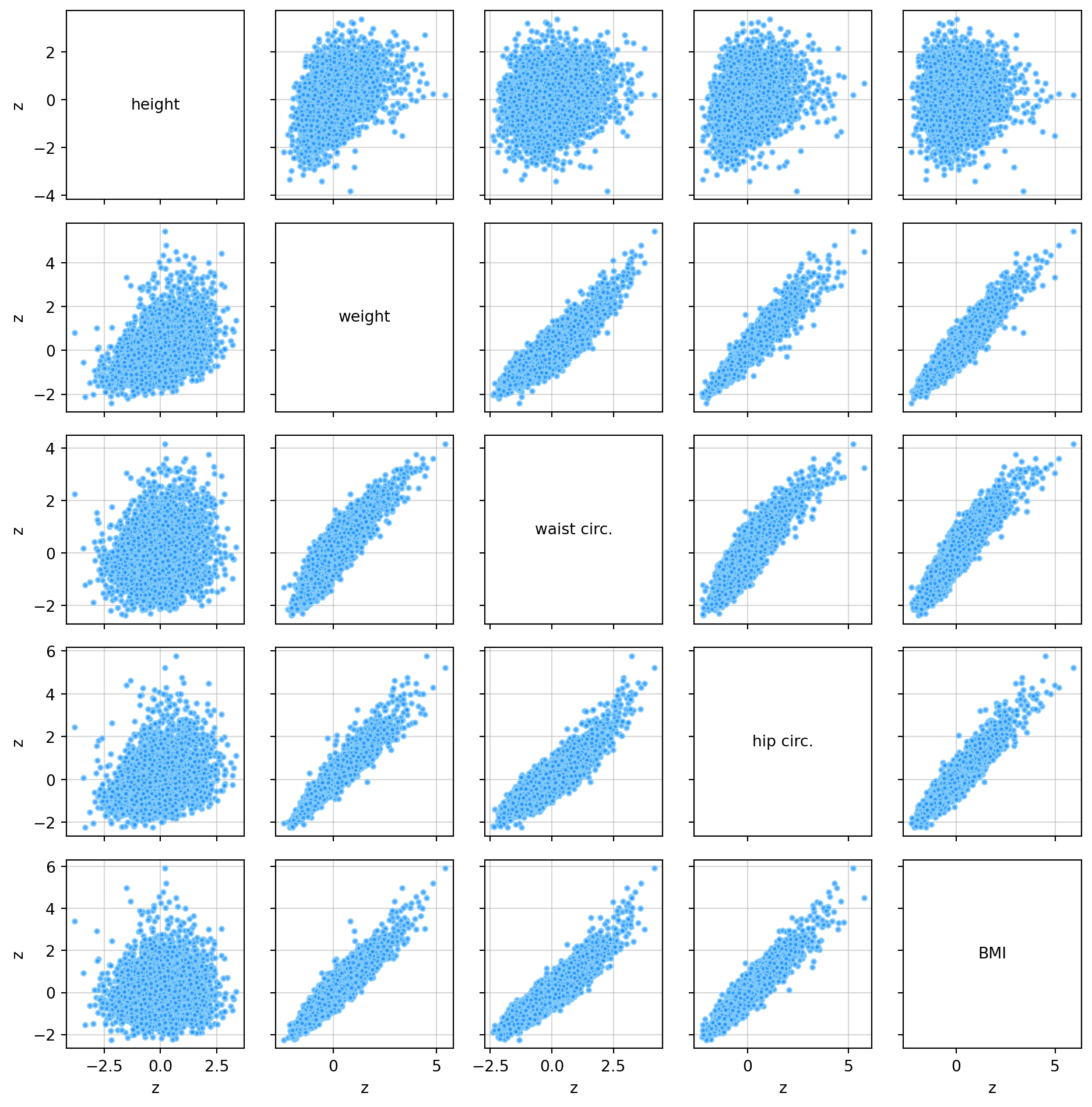 zmale = (male_data - np.mean(male_data, axis=0)) / np.std(male_data, axis=0)The pair_plot function plots a matrix of scatter plots of several variables against each other. These are useful for visually identifying associations between variables.