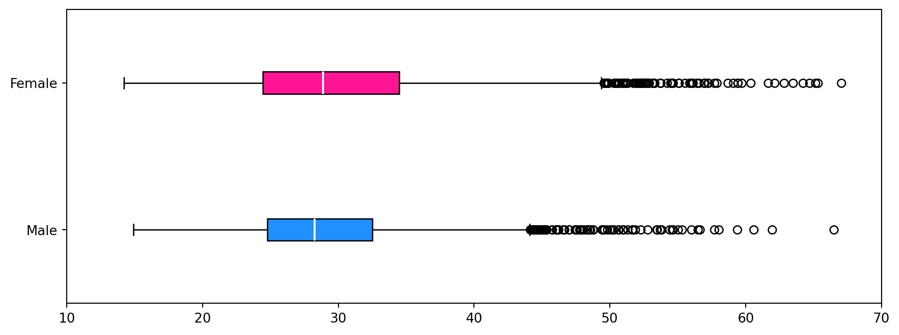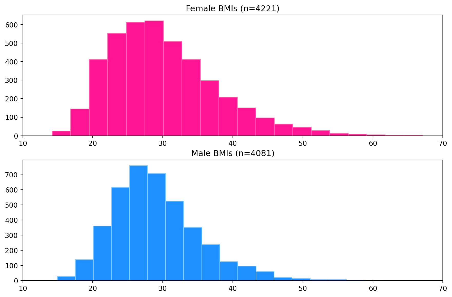 Histogram plots for the female and male BMIs are produced using Matpliblib.pyplot.hist with 20 bins. The plots are created as subplots in a single figure with the same x-axis limits to allow visual inspection and comparison of the distribution of each dataset (see below). The plots have been coloured to help distinguish between them.