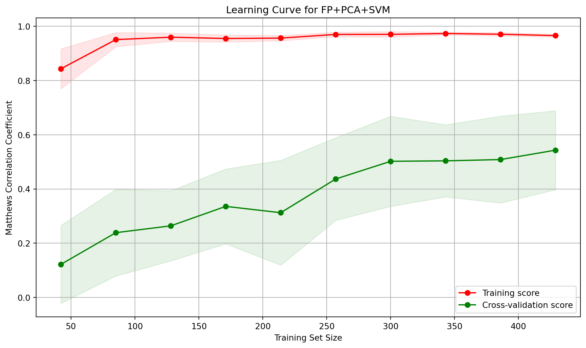 A stratified 10-fold cross-validation was used to incrementally train the model on larger portions of the training data to generate a plot of the learning curve to diagnose the model’s performance. The resulting plot shows the model’s score (specifically, the Matthews Correlation Coefficient) on both the training set and the validation set as a function of the training set size.