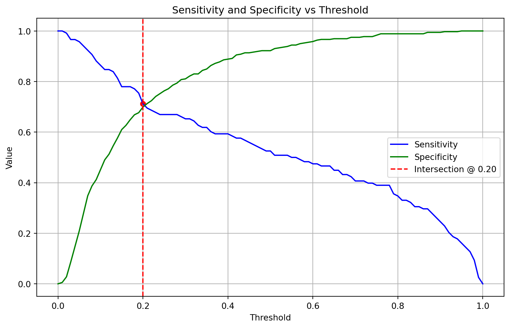 The function calculate_optimal_threshold finds an optimal classification threshold by balancing sensitivity and specificity. Using stratified cross-validation on the training data, it generates out-of-sample probability predictions for each data point. It then iterates through a range of possible thresholds (from 0.0 to 1.0) and calculates the sensitivity and specificity for each one. The function identifies the optimal threshold as the point where the values of sensitivity and specificity are closest to each other, effectively finding the intersection of their curves. The threshold at the intersection point is returned for use in the evaluation stage.