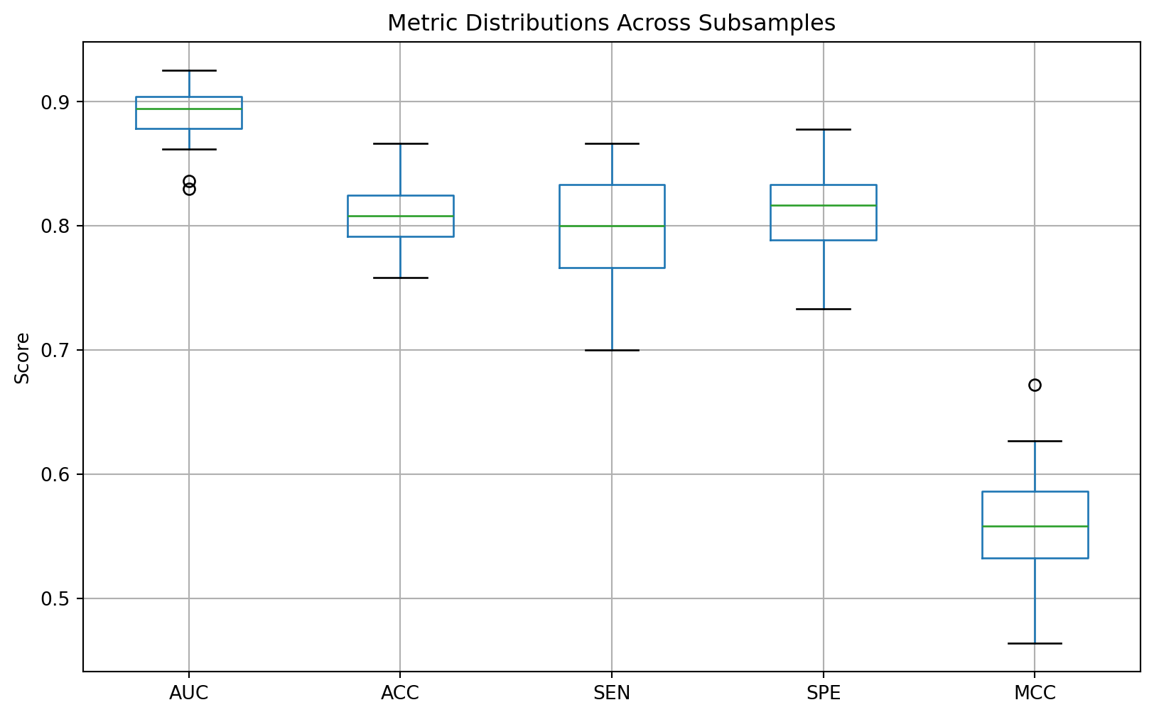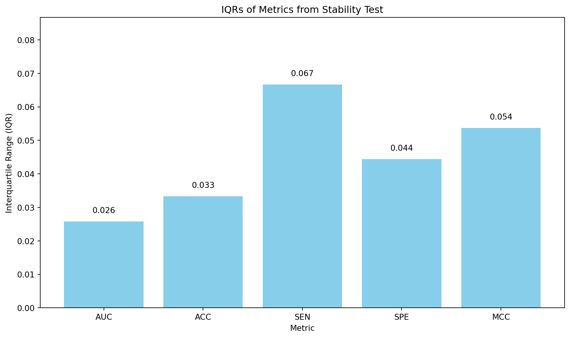 The area under the curve (AUC) and accuracy (ACC) are the most stable metrics, with the lowest IQRs, indicating that the model’s overall ability to distinguish between classes and its general correctness are pretty consistent, even when trained on different subsets of the data. This is a positive sign for the model’s general reliability. The least stable metric is the sensitivity (SEN), which isn’t surprising since the dataset is imbalanced. This result shows that, whilst efforts were taken to minimise the effect of the dataset imbalance, it still does influence the model’s performance.