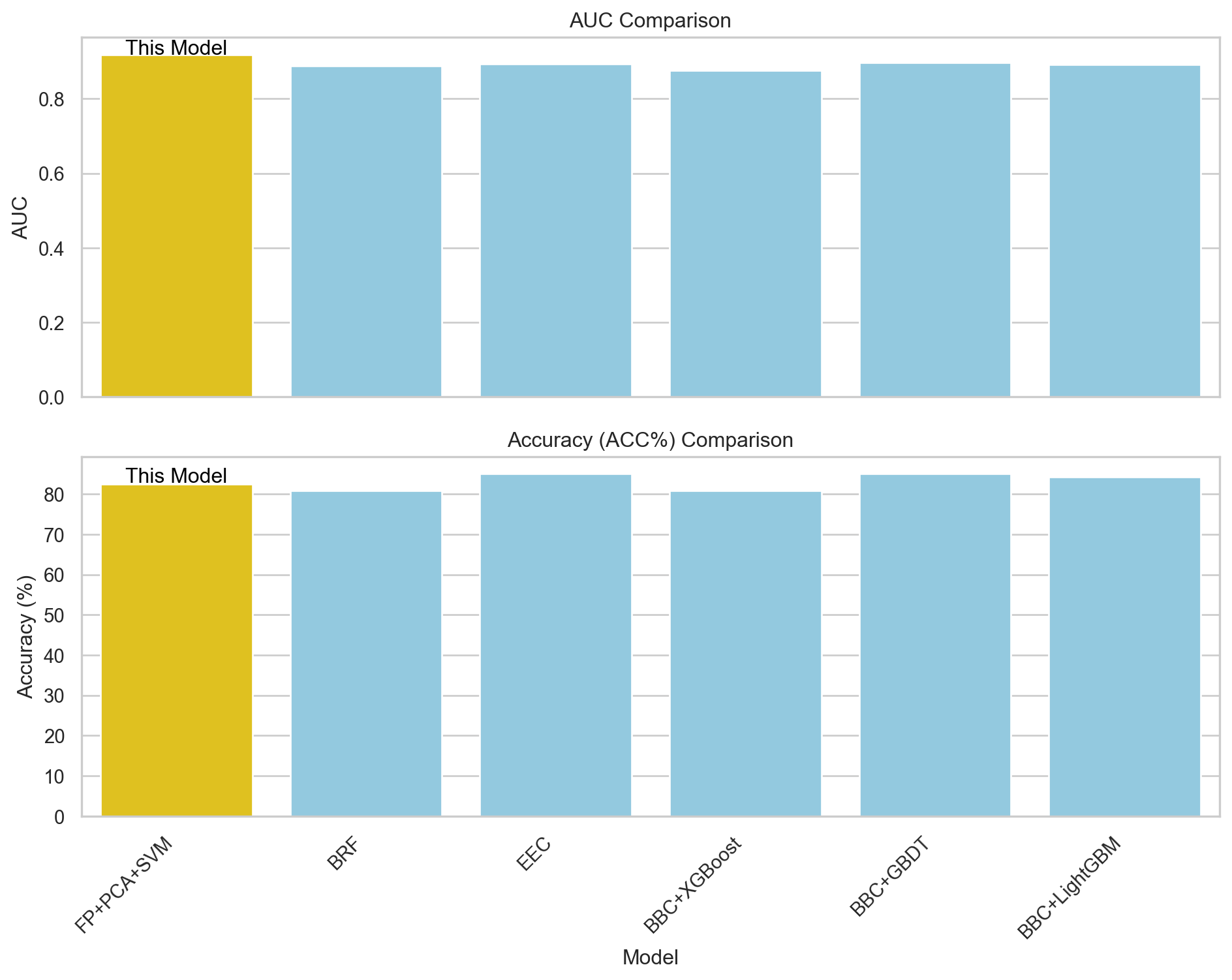 In this section, the results from FP+PCA+SVM are compared with those from the paper discussed in part 1. Comparison of the AUC and ACC metrics shows that the FP+PCA+SVM model outperforms the best model (EEC) from the paper for the AUC and is just slightly lower than EEC in accuracy (ACC). The ROC curves for each model in part 1 are combined with the FP+PCA+SVM model for visual comparison.