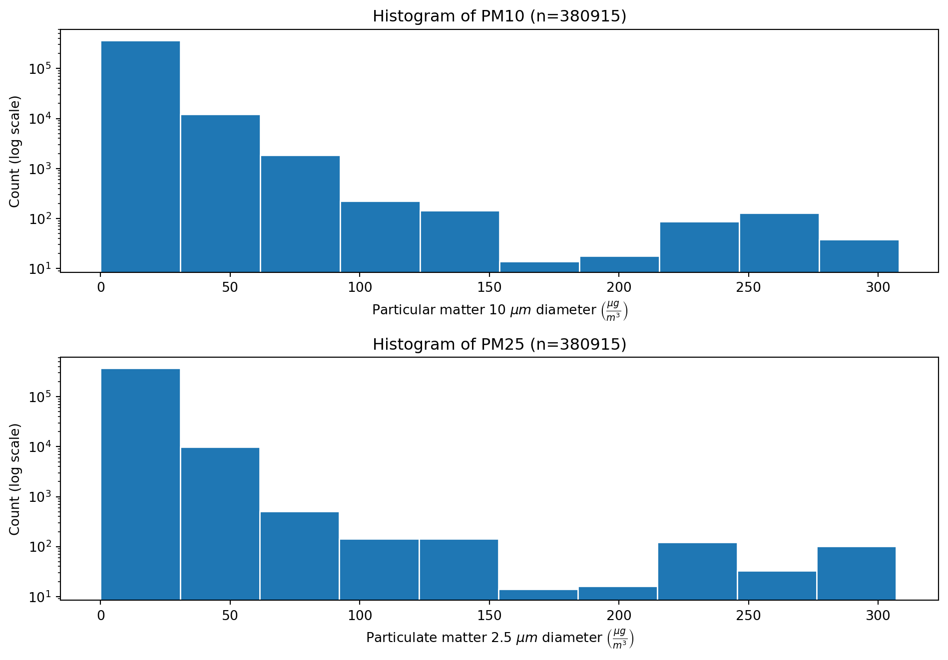 The histograms of the PM10 and PM25 features are shown in the figures below. Both distributions have the shape of an exponential distribution, with high counts at low particulate matter, and the counts decreasing exponentially as the particulate matter increases.