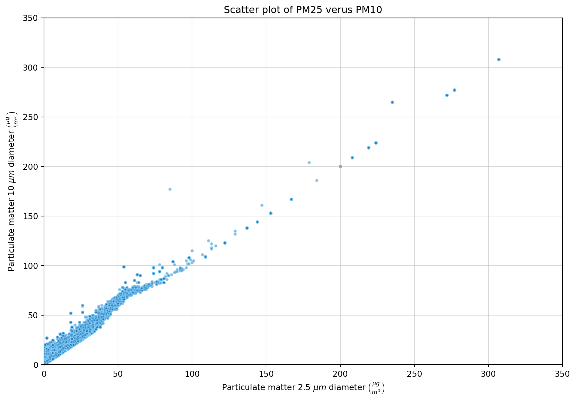 plt.show()To investigate any possible correlation between the PM10 and PM25 features, a scater plot was created to allow visual inspection. Then the pearson correlation cofficient was calculated.