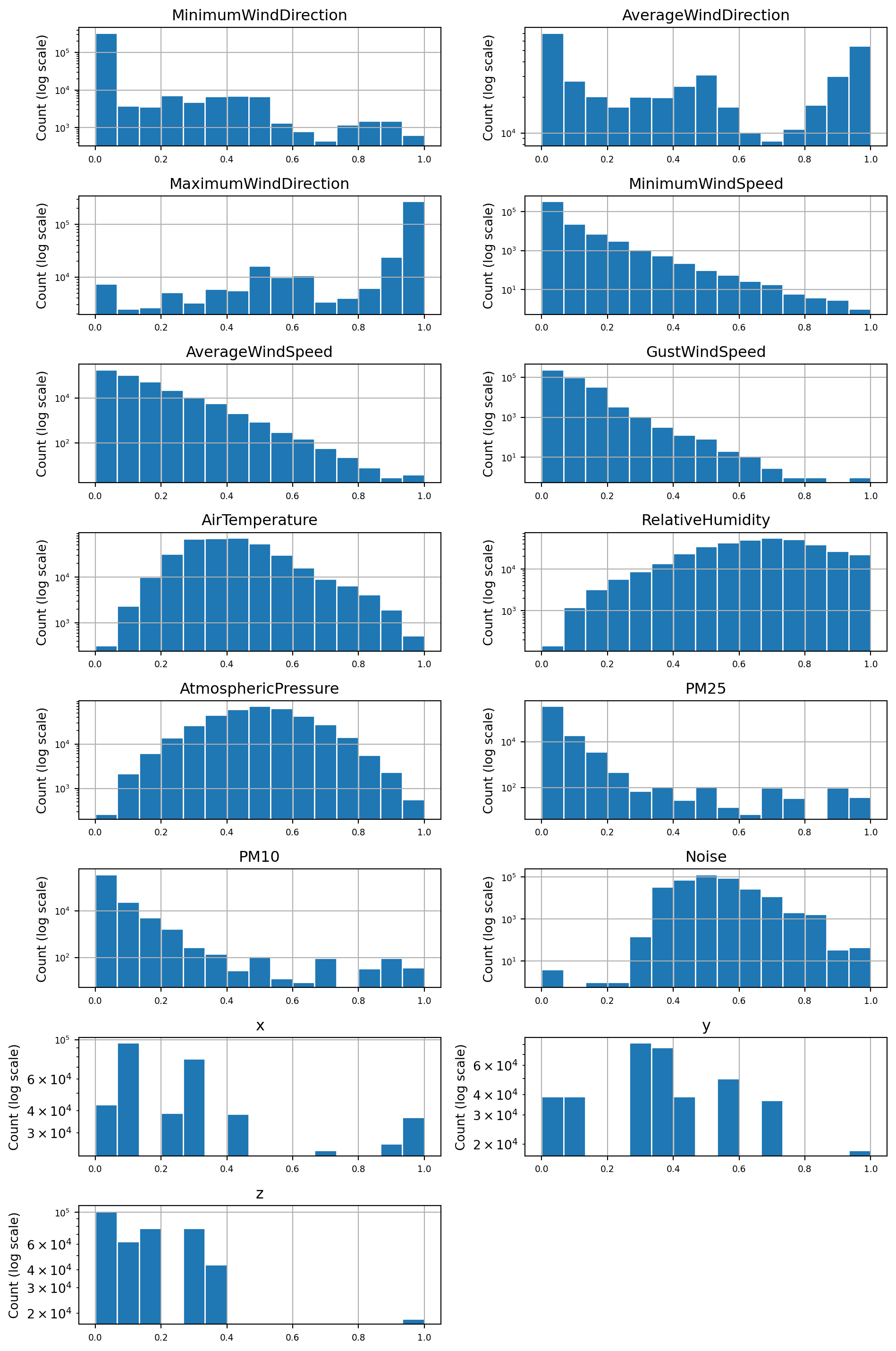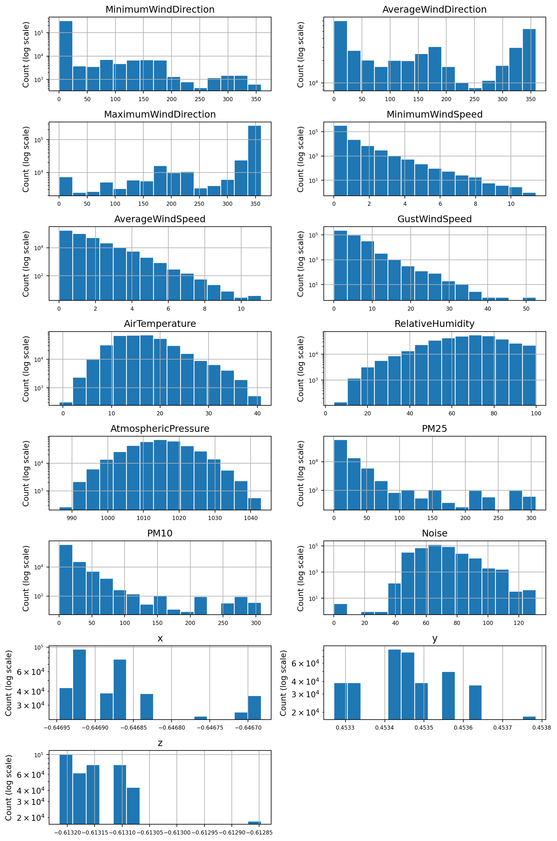 ax2.hist(df_filled["PM25"], num_bins, edgecolor="white", log=True)