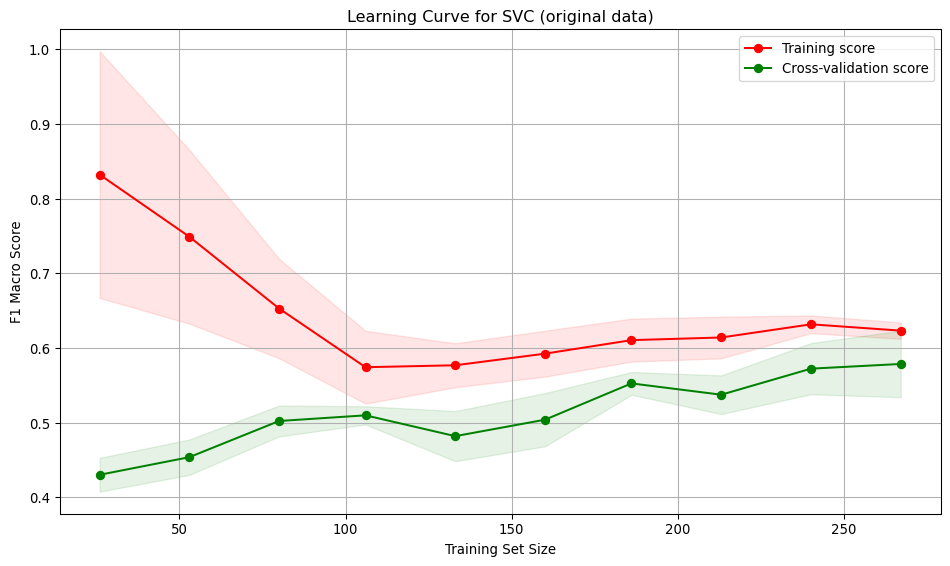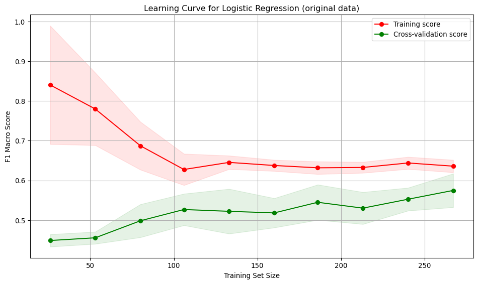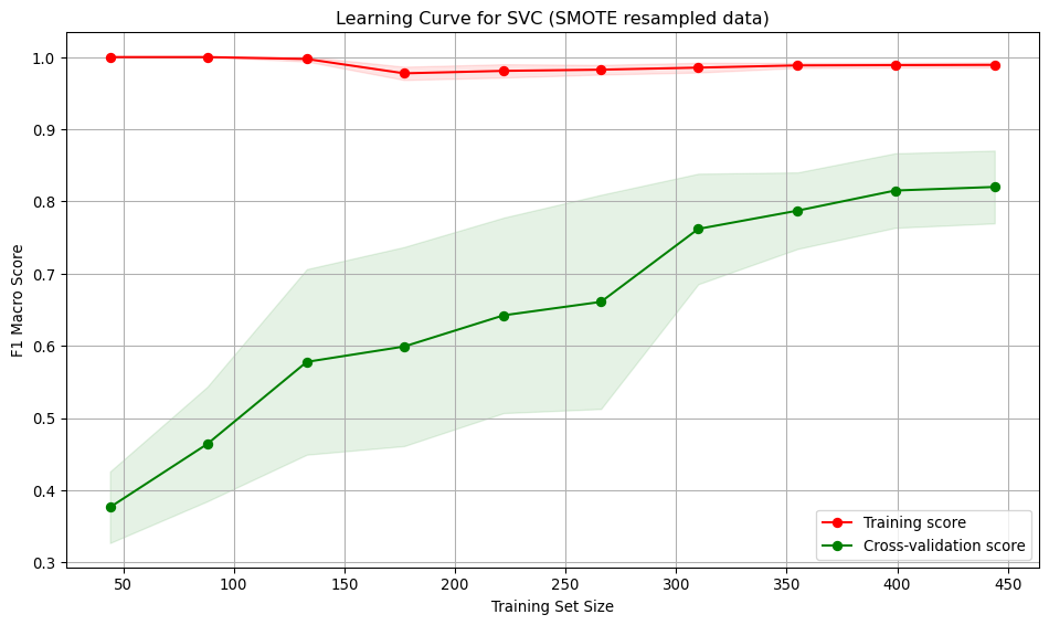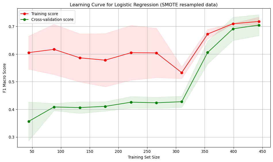 According to the reported results above, all three models using the original training data exhibited under-fitting. Using the resampled data, the SVC model showed signs of over-fitting. Both the logistic regression and decision tree models demonstrate a balance between over- and under-fitting. While the decision tree model shows a higher macro F1 score (0.7422) compared to the logistic regression (0.7045), the logistic regression model has a much lower variation in the validation score, indicating it is more stable across folds and the gap between the training and validation error was smallest. Therefore, the logistic regression model trained on the resampled data is recommended.