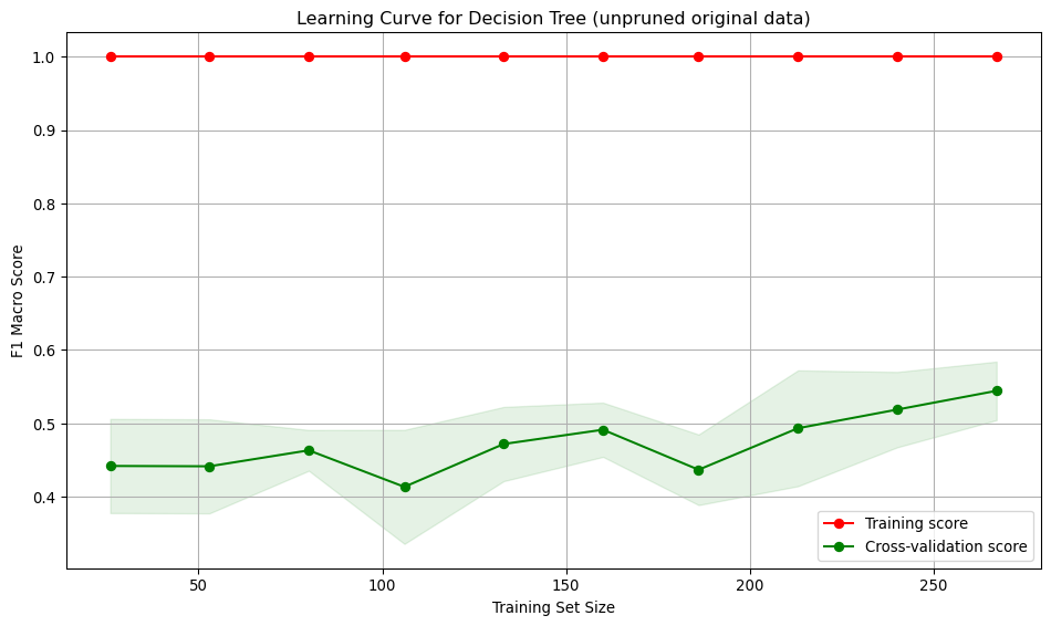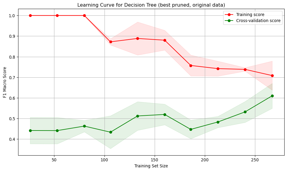 run_cross_validate(best_pruned_tree, X_train, y_train, "Decision Tree (best pruned, original data)")Interpretation: