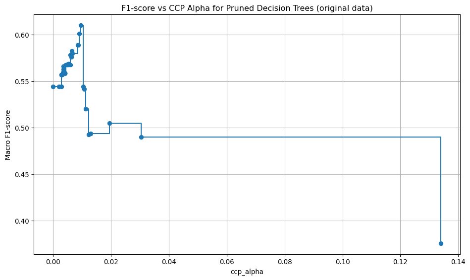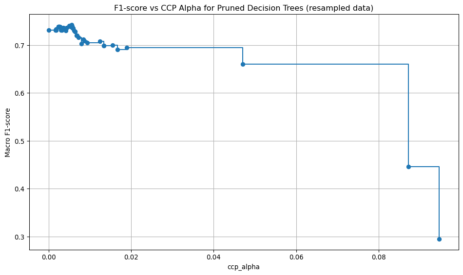 plt.title(f"F1-score vs CCP Alpha for Pruned Decision Trees {label}")