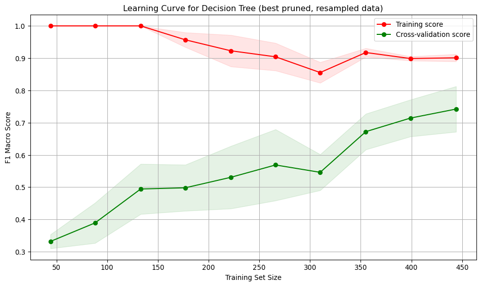 run_cross_validate(best_pruned_tree_smote, X_train_smote, y_train_smote, "Decision Tree (best pruned, resampled data)")Interpretation: * Training score starts at 1, indicating over-fitting on small datasets. As the training set size increases, the score drops slightly but remains high, indicating the model continues to fit the training data well. * Cross-validation score starts low (~0.33) and gradually increases reaching ~0.75. Suggests the model generalises better as it sees more data, and the performance is higher. * Large gap between training curves at small training sizes, implying over-fitting. The model performs well on training data but poorly on unseen data. The gap narrows with more data, indicating improved generalisation and reduced over-fitting.