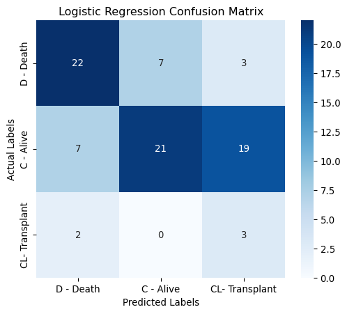 The figure below displays the confusion matrix for the recommended logistic regression model evaluated using the test set. The model performs reasonably well in predicting deaths (D) and alive (C) cases. It struggles most with transplant (CL) cases, especially confusing them with alive (C).