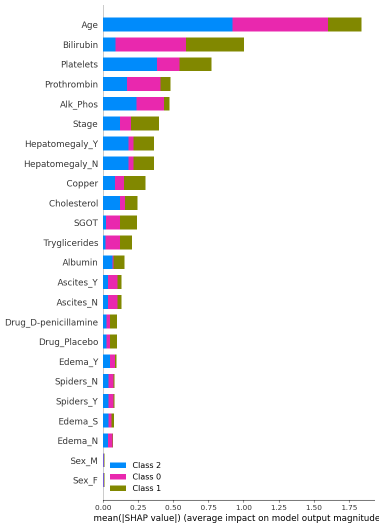 - Platelets, Prothrombin, Alk_Phos, Stage, Hepatomegaly, and Copper: Their moderate SHAP values suggest they consistently influence the model’s output across samples.