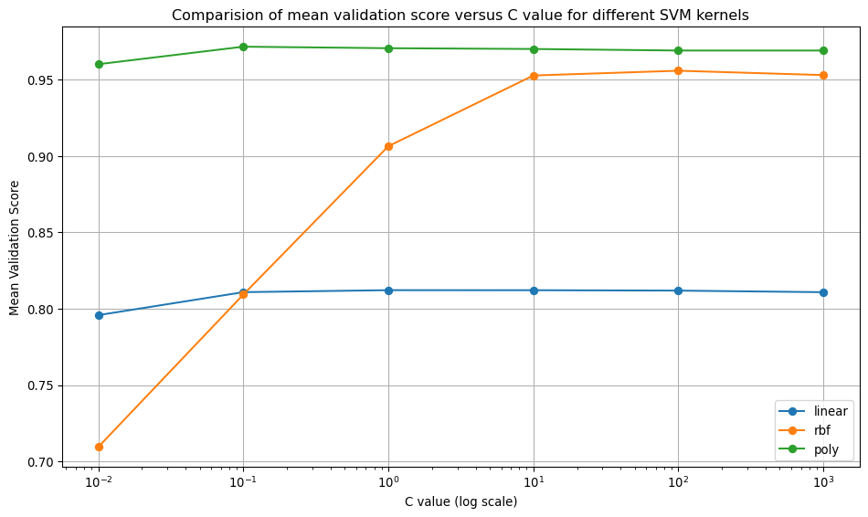 plt.title("Comparision of mean validation score versus C value for different SVM kernels")