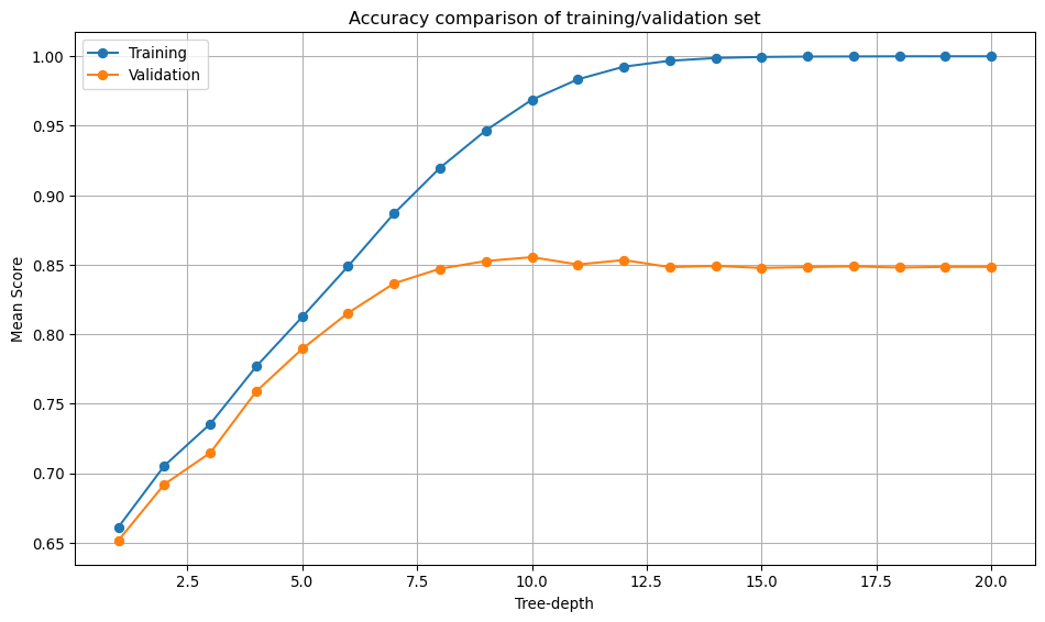 In this section, I train a decision tree and tune its depth. Decision trees have many hyperparameters, but for this exercise, the tuning is limited to “max_depth”. All other hyperparameters are left at their default values.