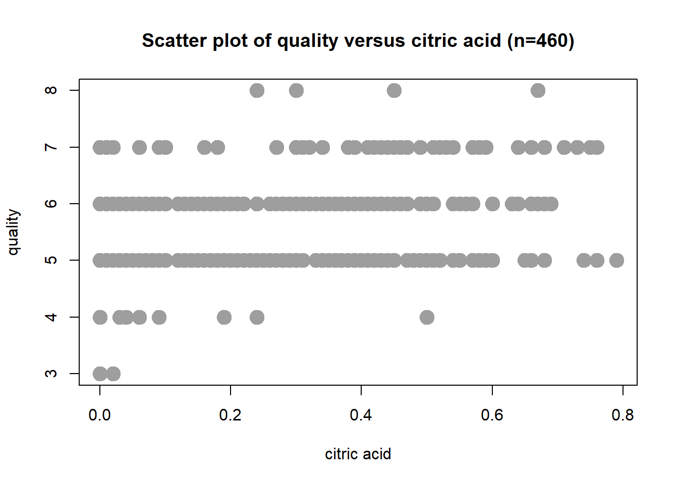 Wine quality increases with increasing citric acid value. The correlation coefficient is r = 0.244.