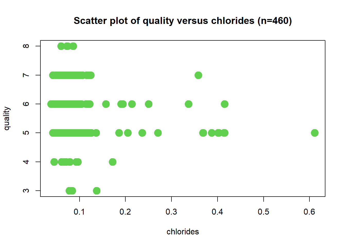 Wine quality decreases with increasing chlorides value. The correlation coefficient is r = -0.122. A potential outlier is observed at 0.61 chlorides value. A negation function will be required.