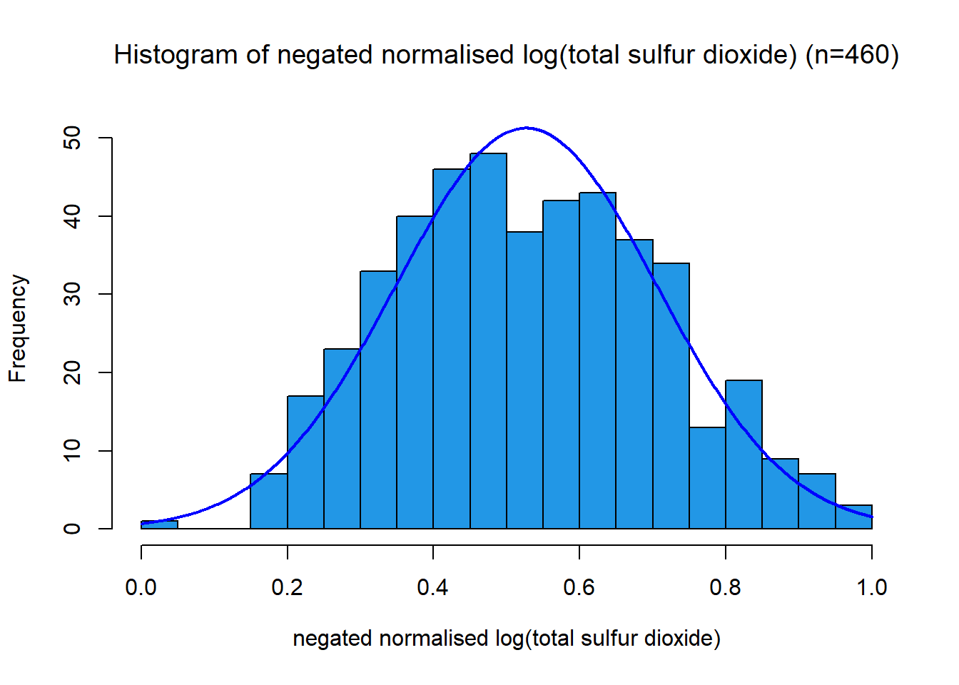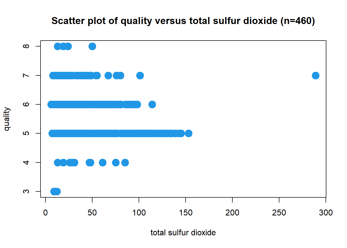 Wine quality decreases with the increasing value of total sulphur dioxide. The correlation coefficient is r = -0.206. A possible outlier at a value of 289 for total sulfur dioxide. A negation function will be required.