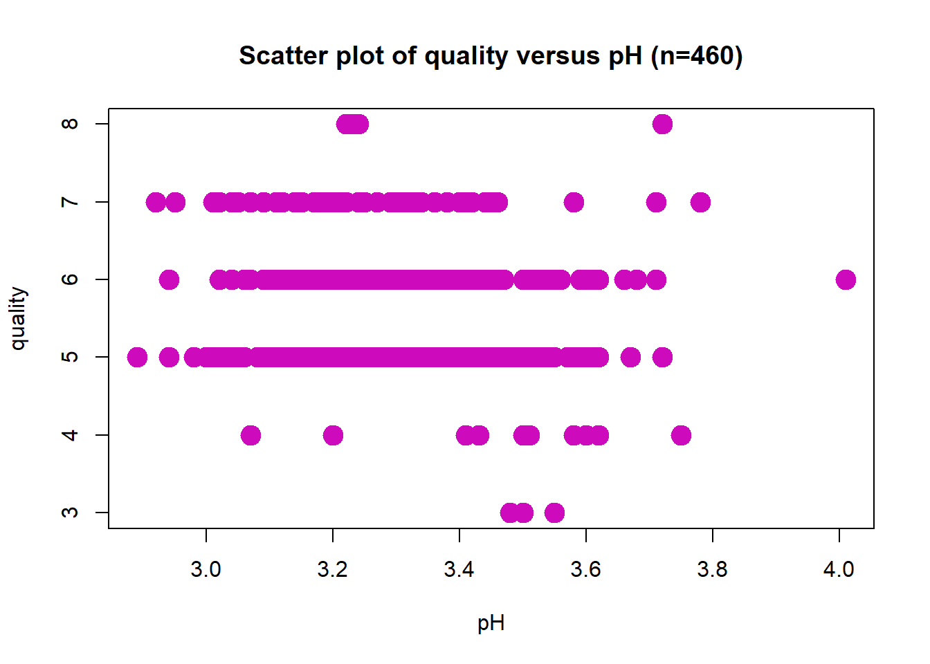 Wine quality does not appear to have a linear relationship with pH. The correlation coefficient is r = -0.072. Potential outlier at pH value of 4.0.