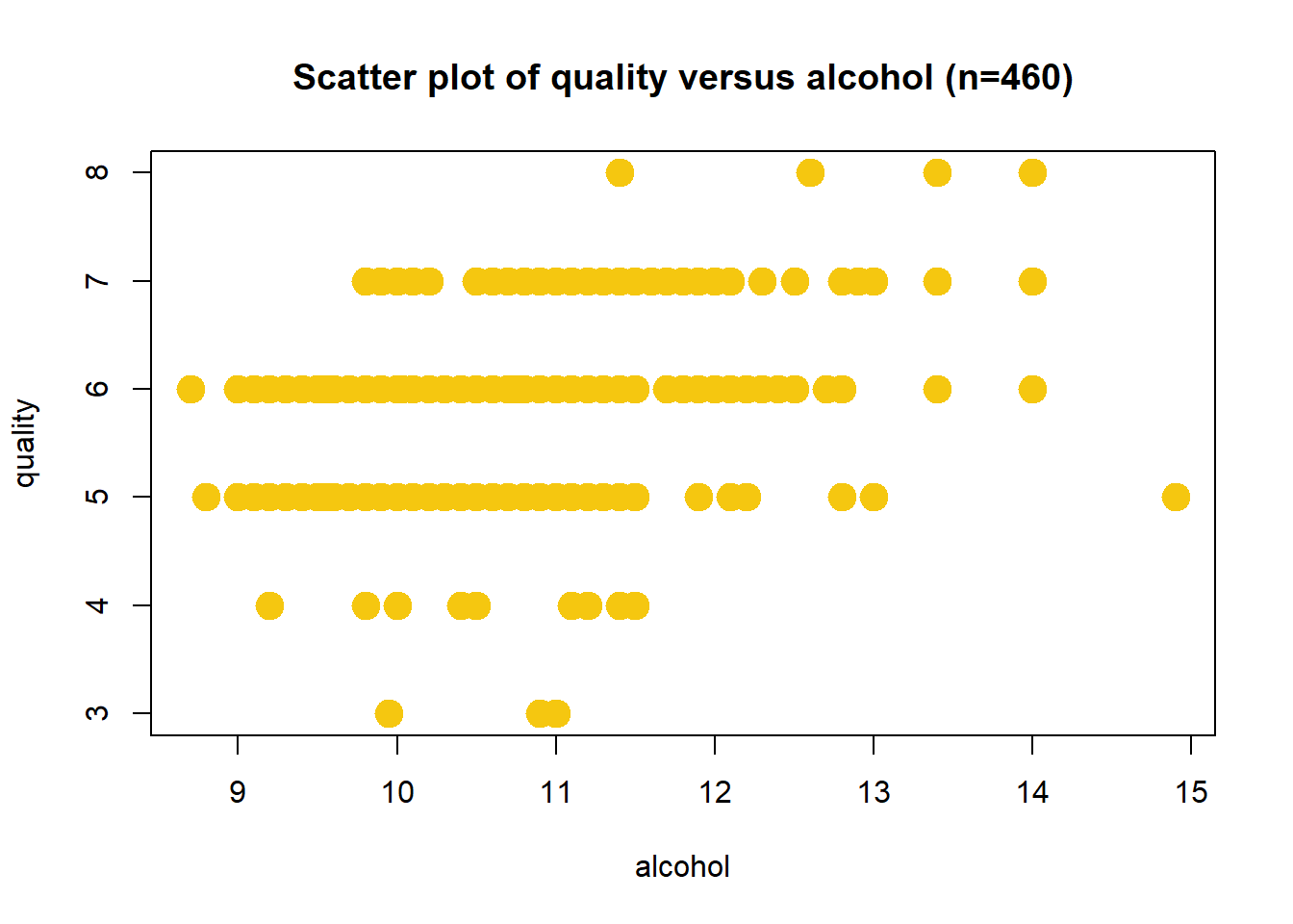 Wine quality increases with alcohol content. The correlation coefficient is r = 0.442.