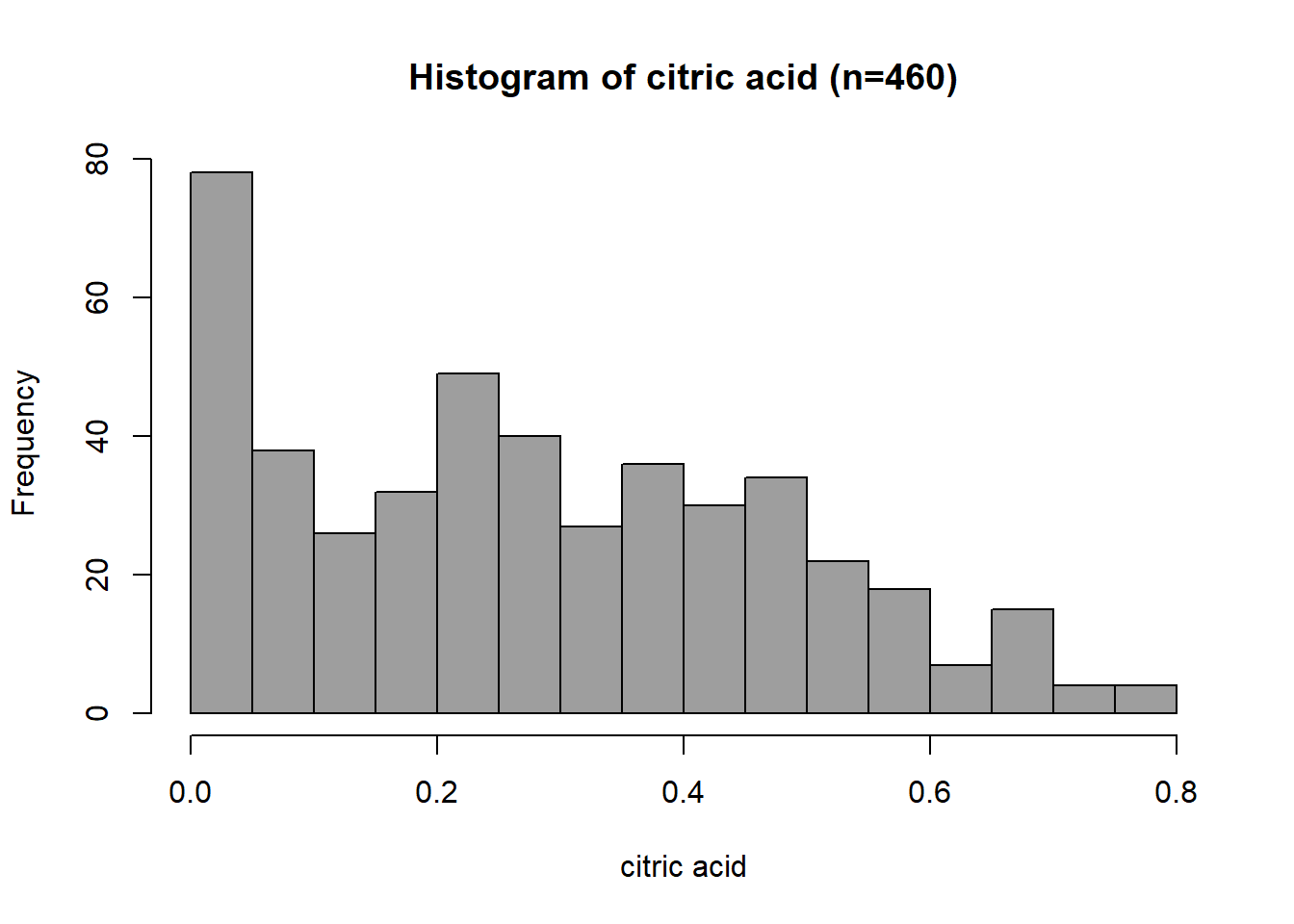 The distribution of citric acid is uniform for the middle values. However, many observations show a peak near-zero value. At the higher citric acid values, fewer observations give the distribution a right (positive) skew. The distribution range is from 0.000 to 0.790, with a median value of 0.260 and a mean of 0.284.