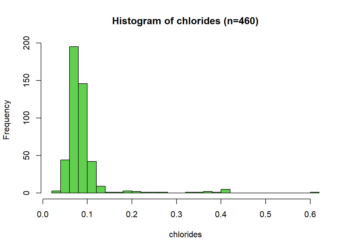 The distribution of chlorides is unimodal with significant right (positive) skew. Most of the chlorides observations are between 0.04 and 0.15. Values above 0.15 have very few counts and are potential outliers. The distribution range is from 0.038 to 0.611, with a median value of 0.080 and a mean of 0.0912.