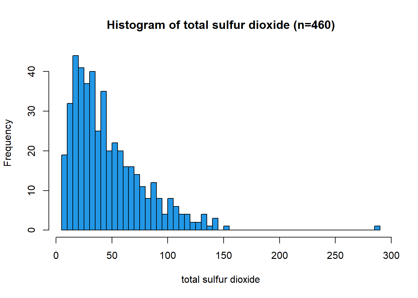 The distribution of total sulfur dioxide is unimodal with right (positive) skew and reassembles a log-normal shape. The value of 289 appears to be an outlier. The distribution range is from 6.0 to 289.0, with a median value of 38.5 and a mean of 47.12.