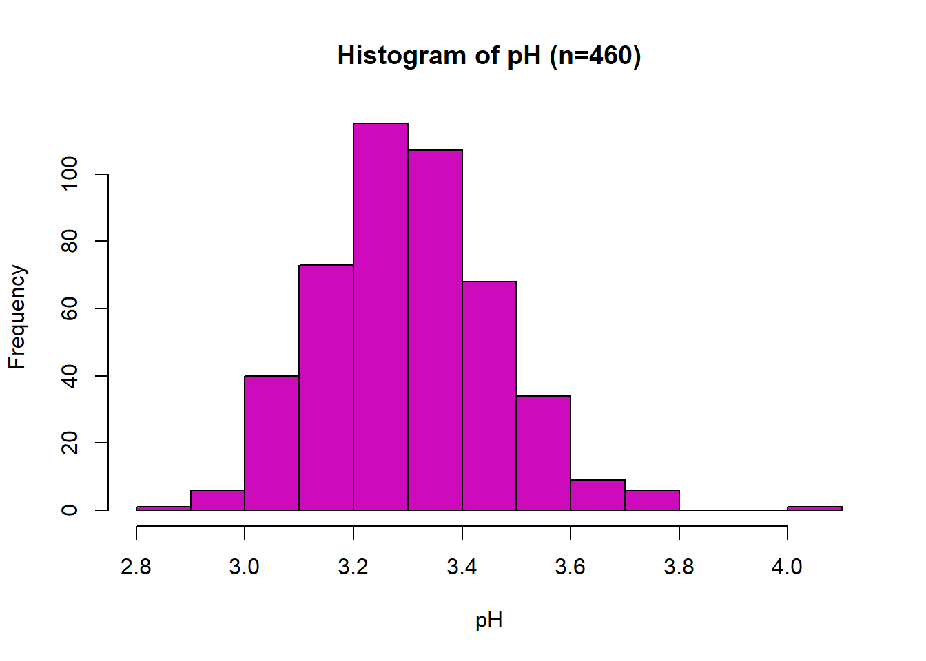 The distribution of pH is unimodal with minimal skew and a potential outlier at 4.01 and has a normal distribution shape. The distribution range is from 2.89 to 4.01, with a median value of 3.30 and a mean of 3.31.