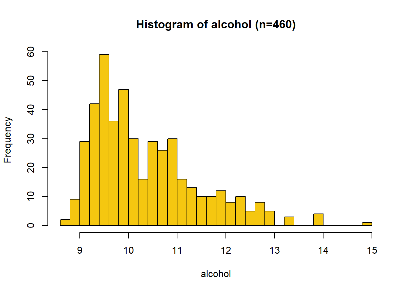 The distribution of alcohol is unimodal with right (positive) skew and reassembles a log-normal shape. It ranges from 8.7 to 14.9, with a median value of 10.1 and a mean of 10.4.