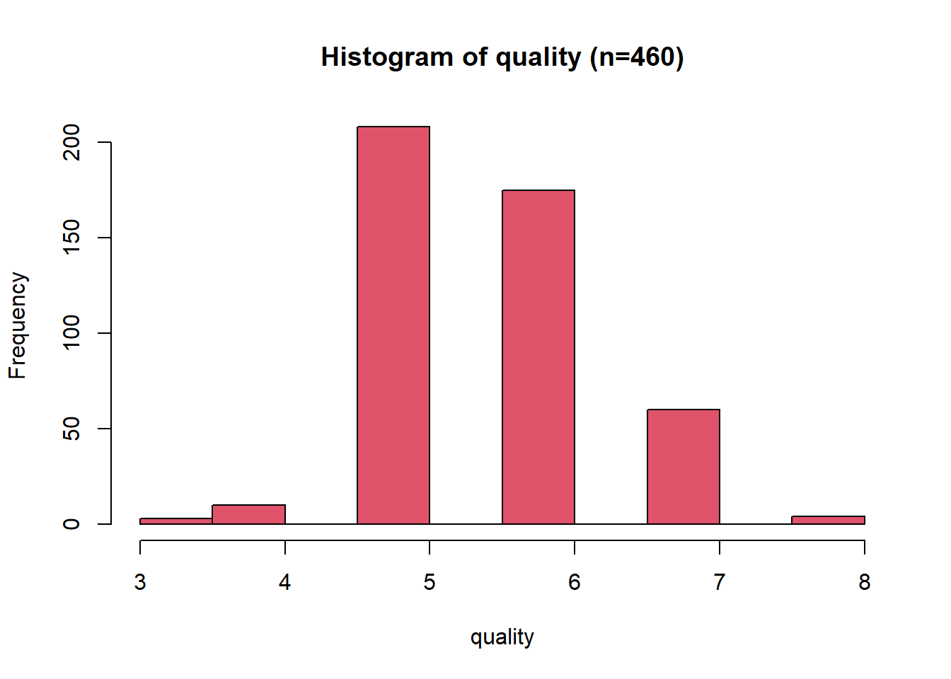 The quality distribution is unimodal, with some right (positive) skew having a normal distribution shape. The data contains only integer values, which leads to gaps in the histogram unless a small number of bins are used. The distribution range is from 3 to 8, with a median value of 6 and a mean of 5.6.