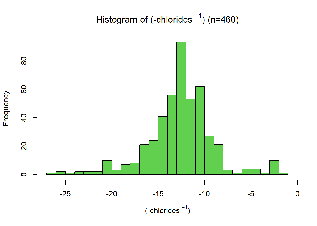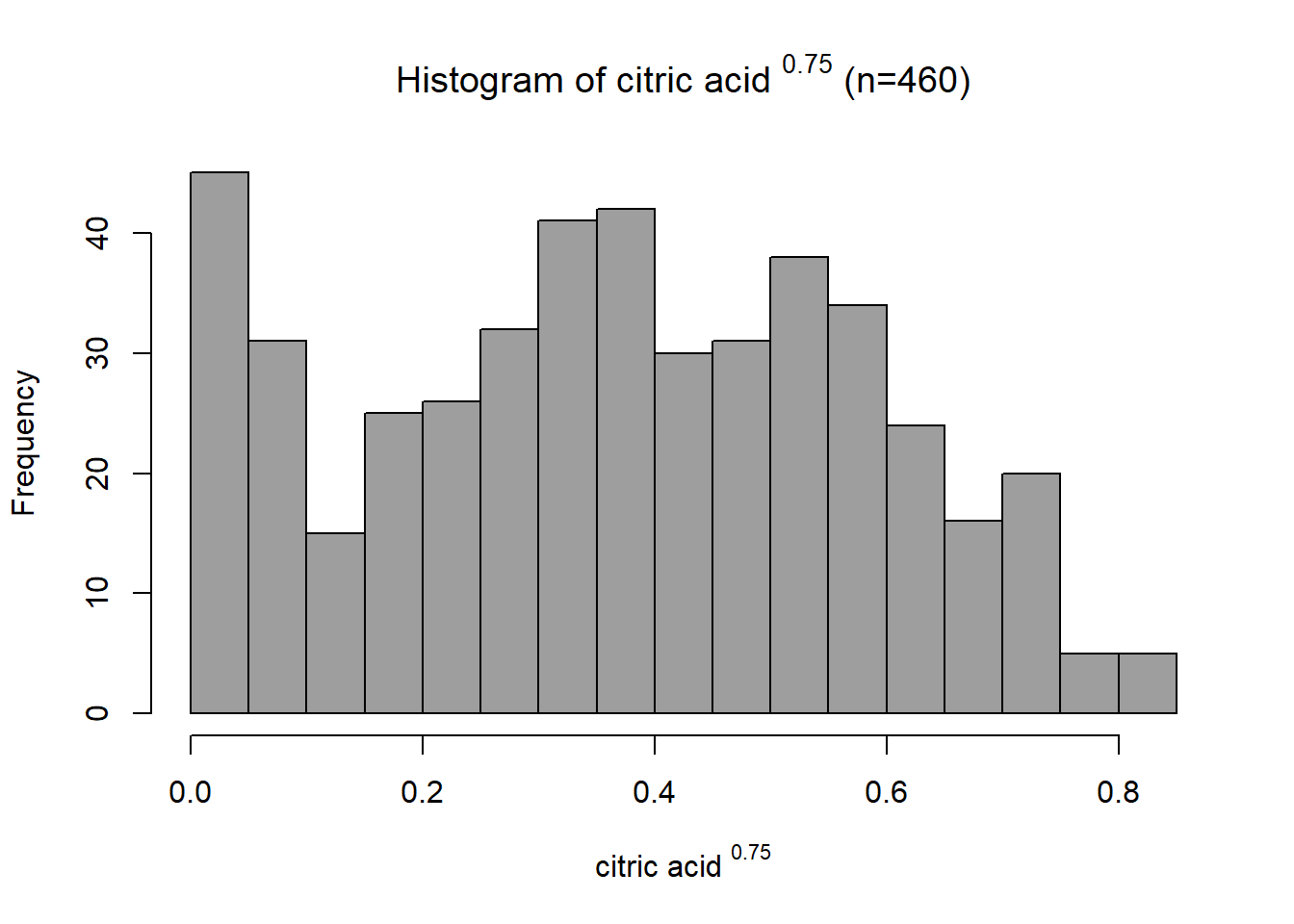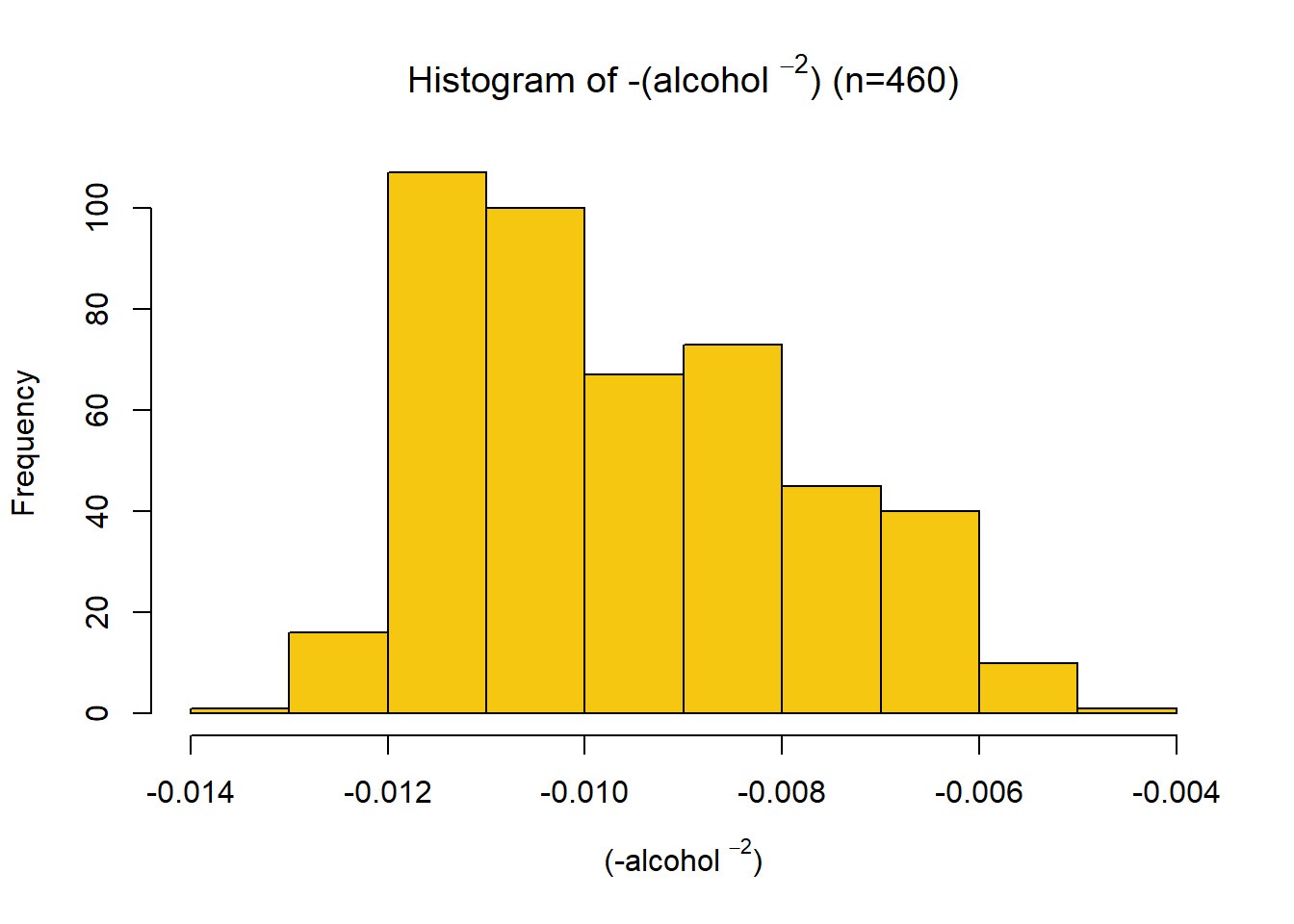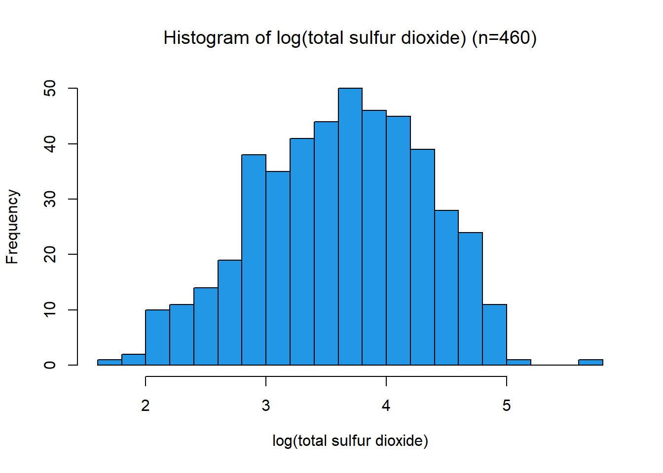 hist(data.transformed[,5],xlab=name5, breaks=8, main=title5, col=colours[I[5]])# We know the quality could range between 0 and 10, so use those values here.
