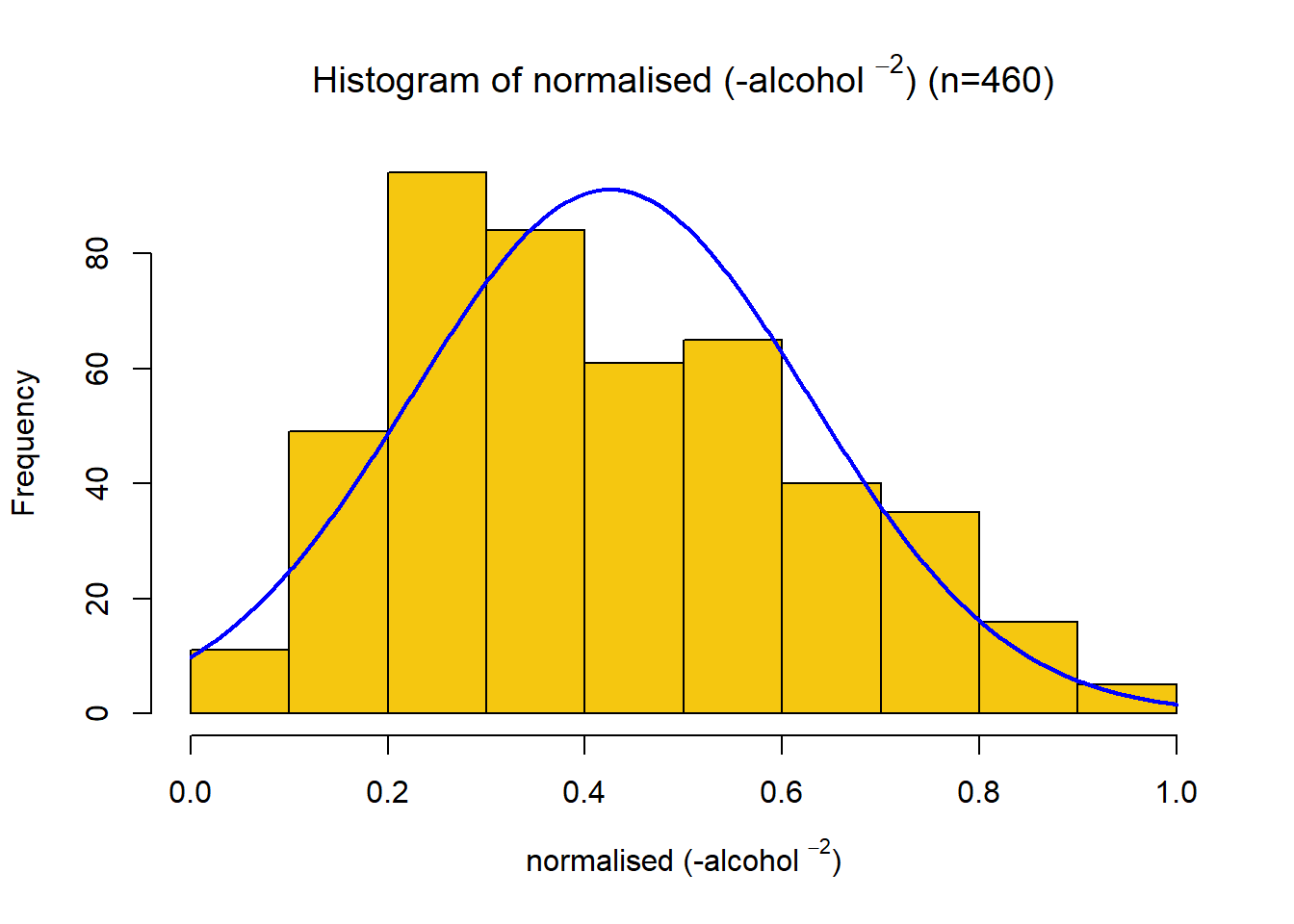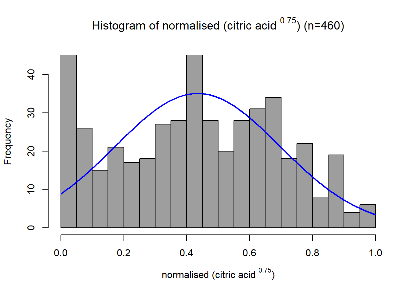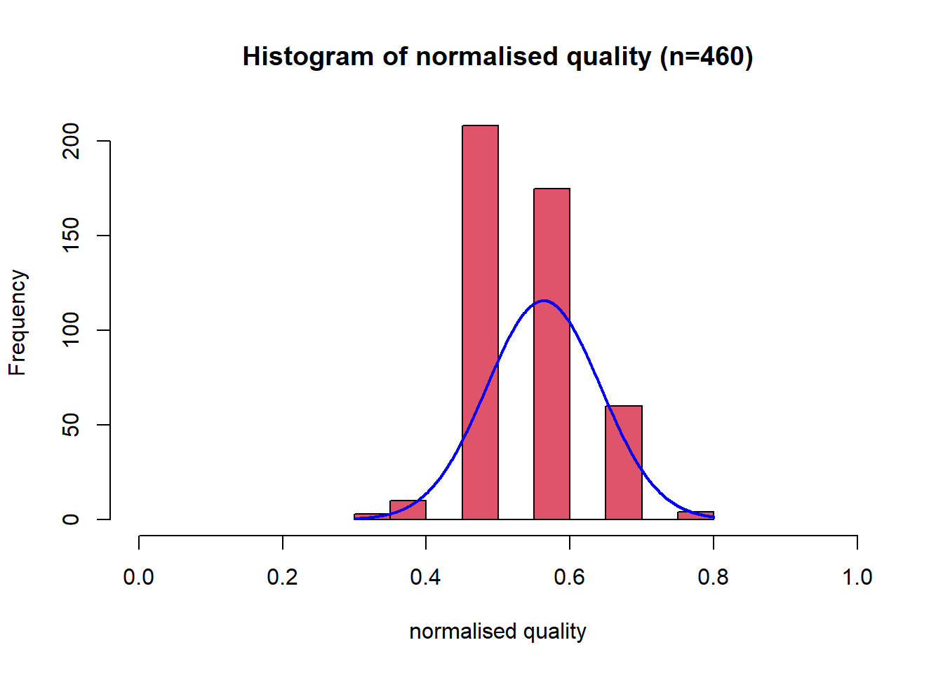 plotNormalHistogram(data.transformed[,5], xlab=name5s, breaks=8, main=title5s, col=colours[I[5]],xlim=c(0,1))# Save this transformed data to a text file