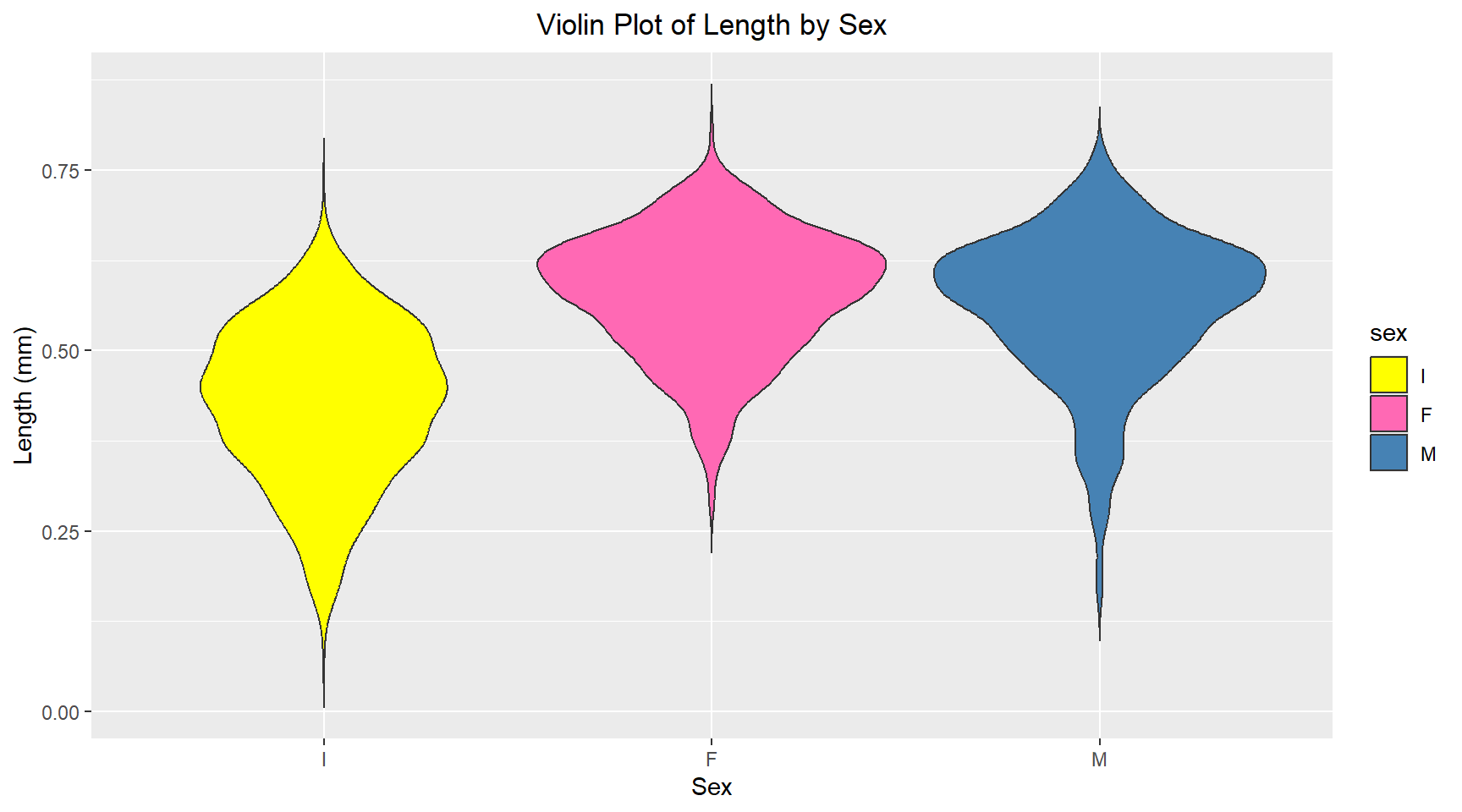 labs(title = "Violin Plot of Length by Sex", x = "Sex", y = "Length (mm)") +