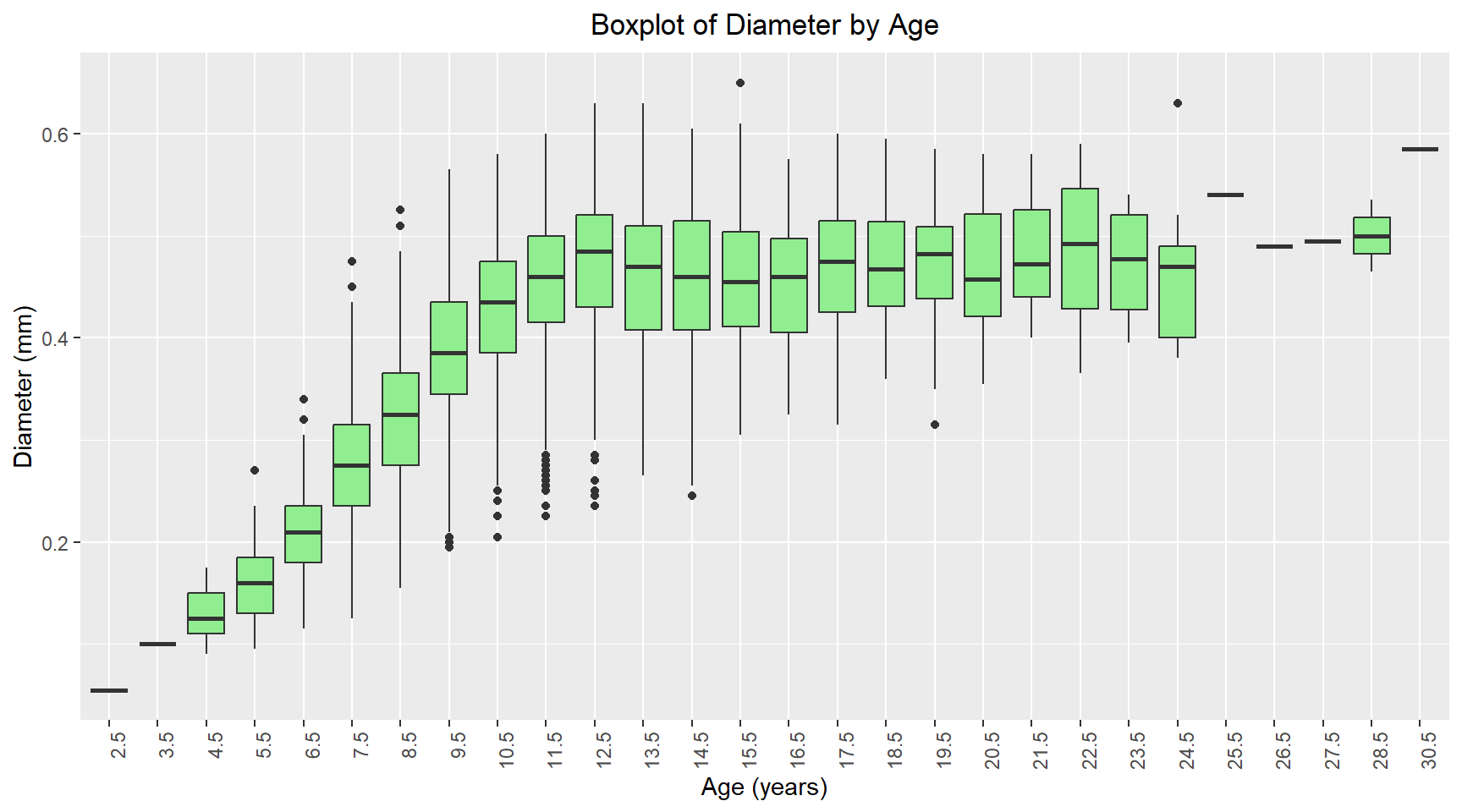 labs(title = "Boxplot of Diameter by Age", x = "Age (years)", y = "Diameter (mm)") +
