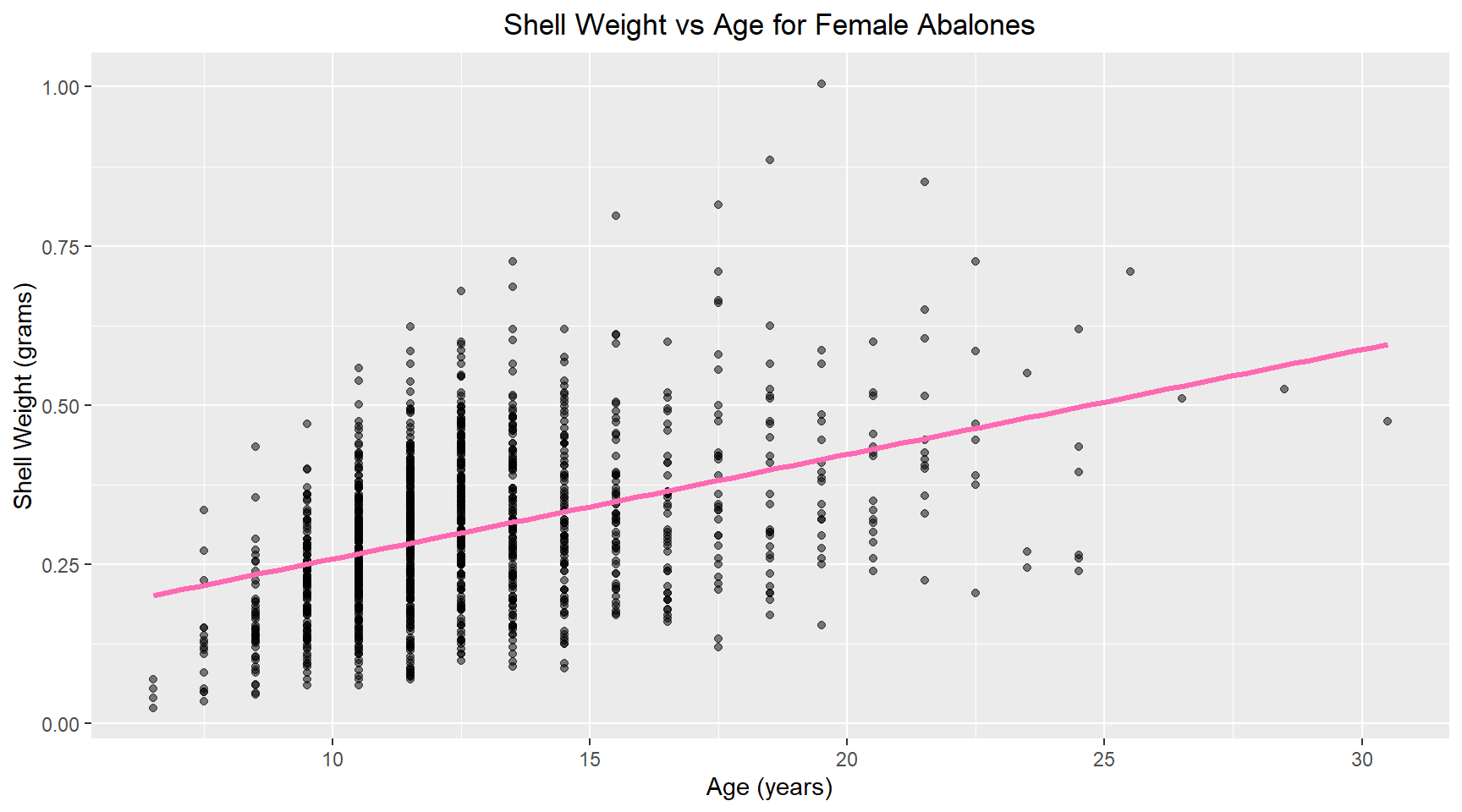 labs(title = "Shell Weight vs Age for Female Abalones", x = "Age (years)", y = "Shell Weight (grams)") +