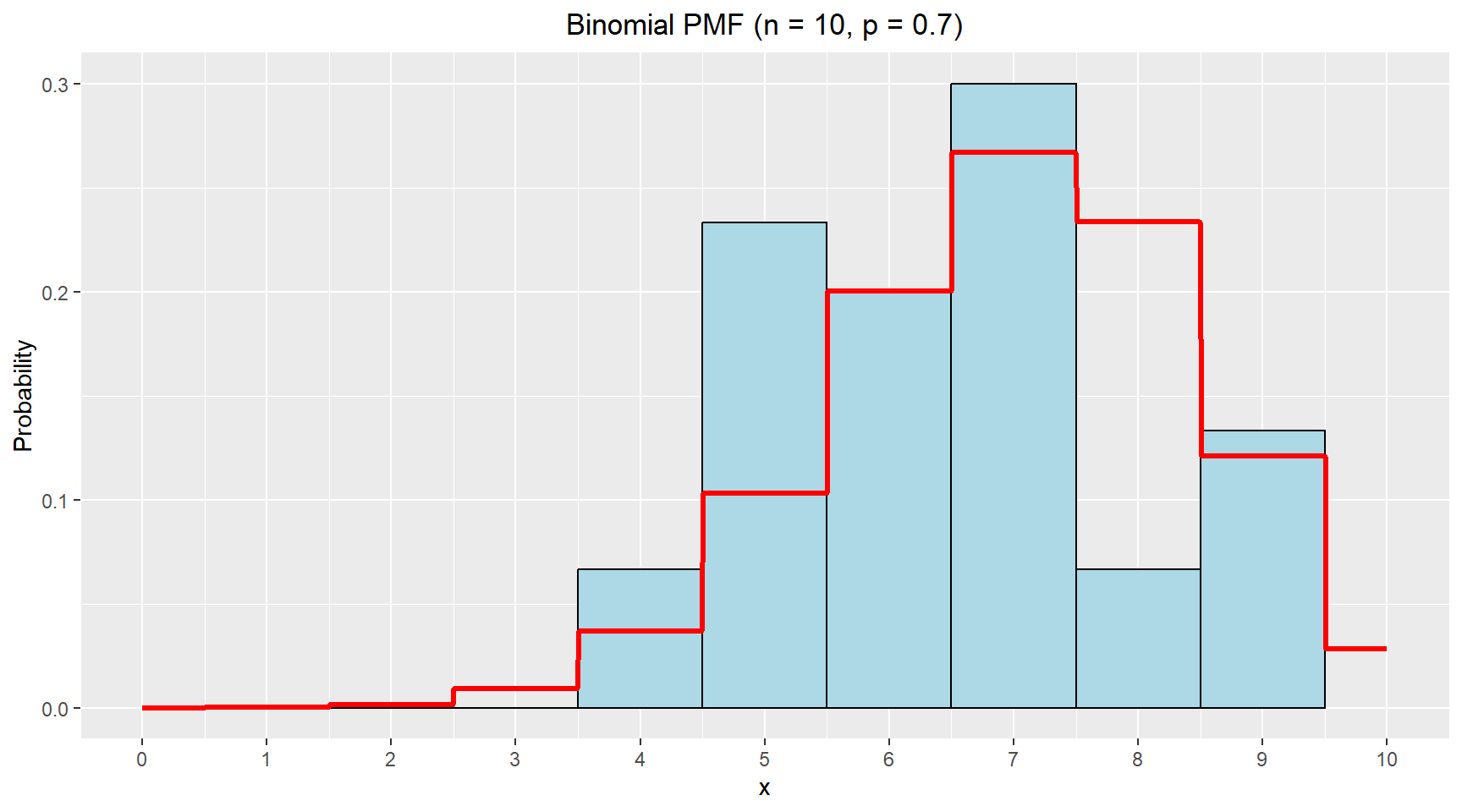 labs(title = "Binomial PMF (n = 10, p = 0.7)", y = "Probability") +
